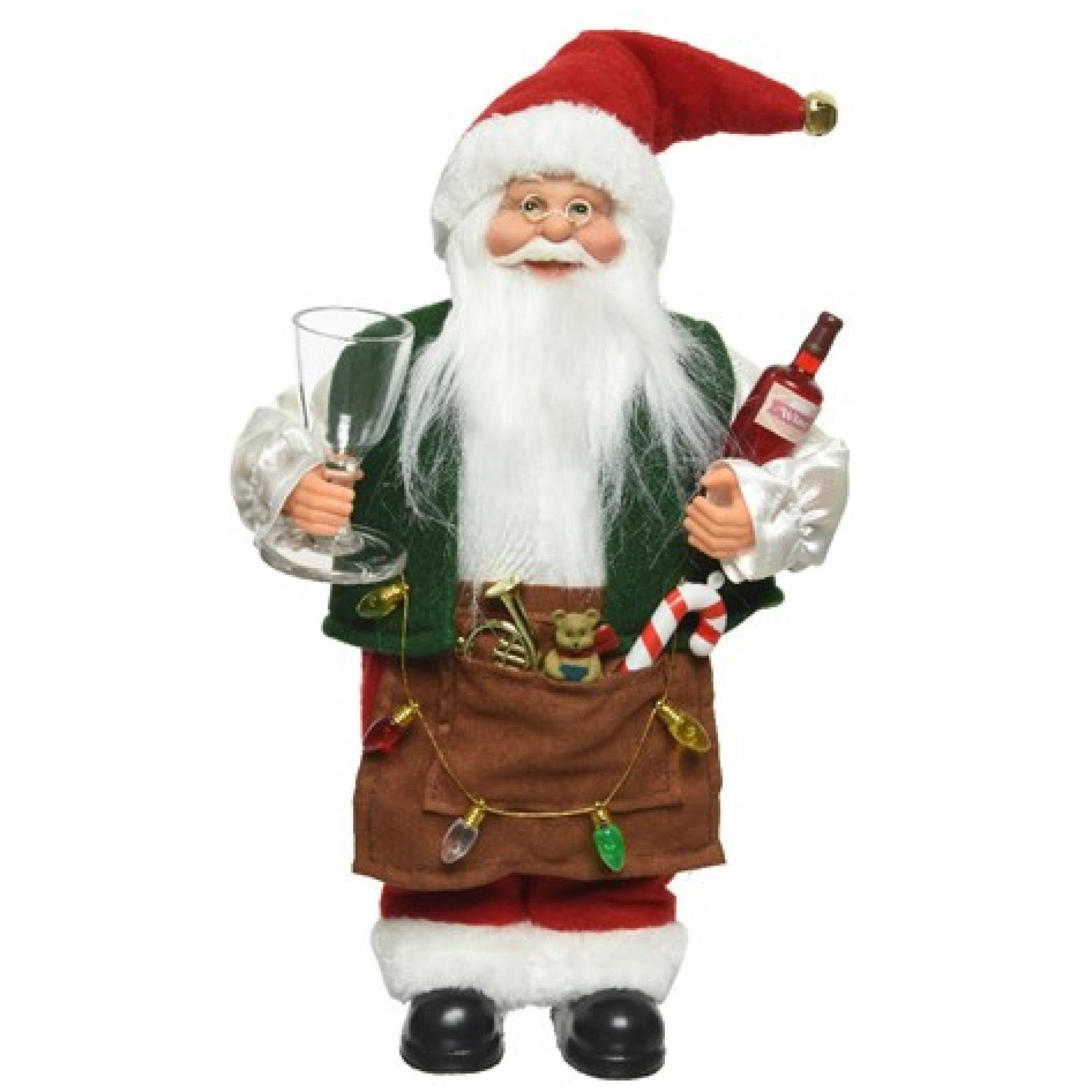Merry standing Santa display item holding a bottle of wine and glass in either hand.